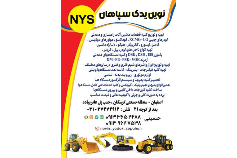 نوین یدک سپاهان NYS مرکز پخش و فروش کلیه قطعات و لوازم یدکی وارداتی و اصلی مناسب برای انواع خودروهای ایرانی و خارجی به صورت عمده و خرده با کیفیت بالا و قیمت مناسب و تهیه و توزیع کلیه قطعات ماشین آلات راه سازی و معدنی و لودرهای چینی و موتورهای دوئیتس به مدیریت جناب آقای حسینی